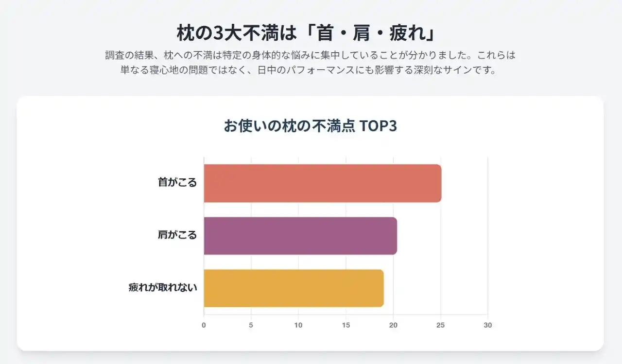 本調査で、現在の枕に62.3%が「不満」と回答 、その不満の内訳は「首こり」「肩こり」「疲れが取れない」 といった、日中のパフォーマンスに直結する身体的な悩みが上位を占めました。さらに、4人に1人(26.8%)が自らを「枕難民」と認識している、という事実は、既存製品では満たされていないニーズがいかに多いかを示しています。 |