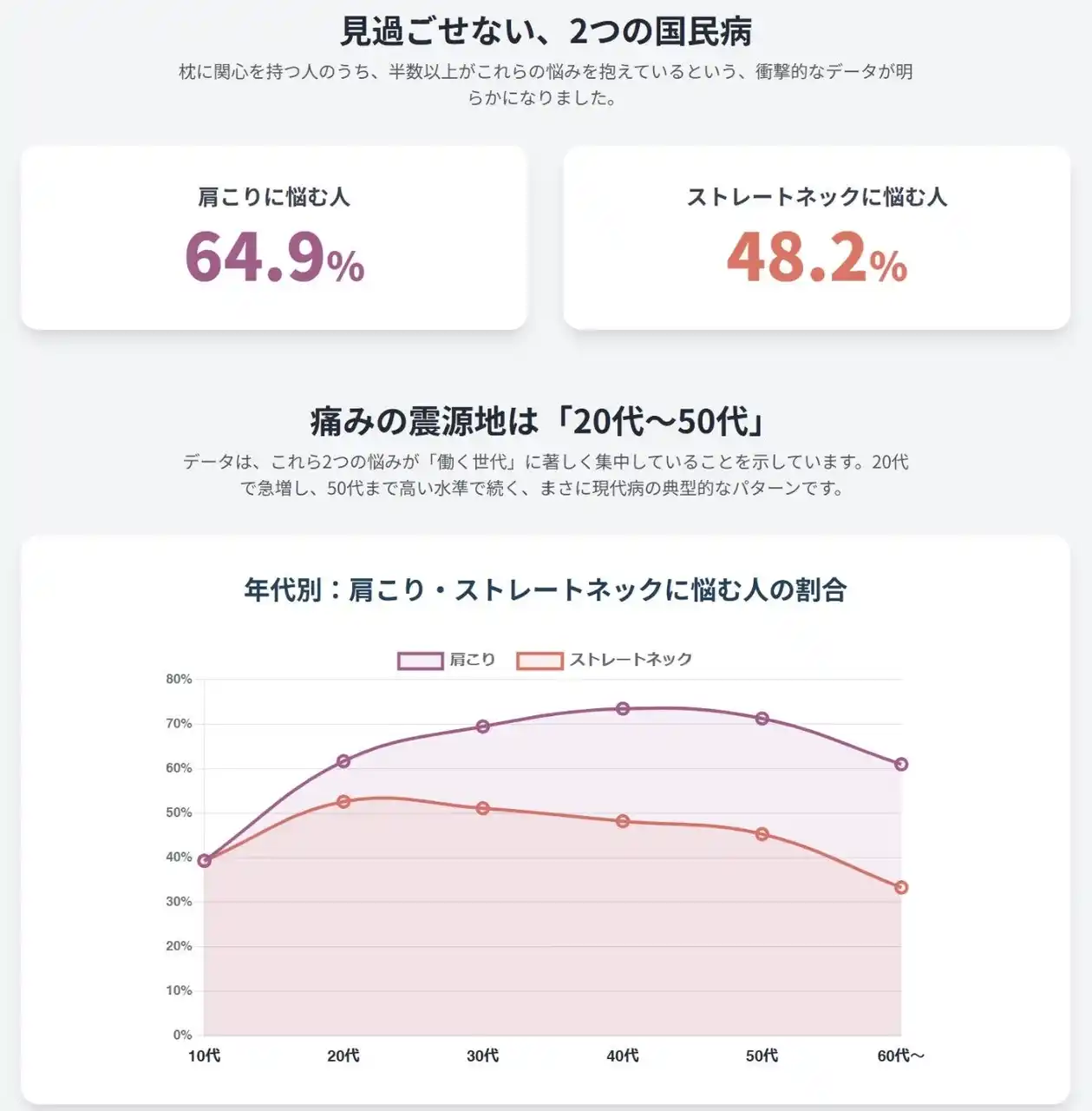 | 特筆すべきは、肩こりに悩む人(全体の64.9%) やストレートネックに悩む人が、20代から50代の「働く世代」に集中している点です 。従業員の睡眠の質は、日中の集中力や創造性、ひいては企業全体の生産性に直結する重要な経営資源です。 | |||