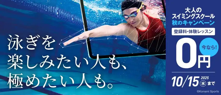 大人のスイミングスクール キャンペーン特設ページ https://www.konami.com/sportsclub/school/swimming/campaign/20250829/ |