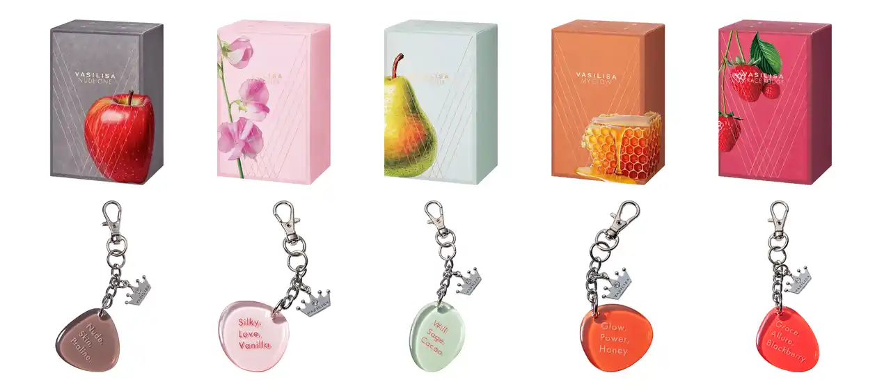 9月のキャンペーン期間中、ヴァシリーサ ヌード ワン シリーズのオードパルファム5種(各40mL、各4,400円(税込))に、チャーム付き限定パッケージが登場します。各香りのエディブルノートが大胆にプリントされたパッケージに、それぞれの香りのコンセプトが記されたオリジナルチャームを付属しています。 |