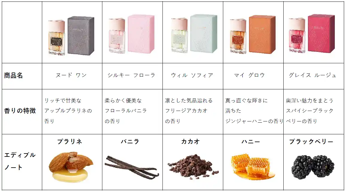 “食べられる(英:edible)”ものをモチーフにしたキー香料を全ての香りに配合。 |