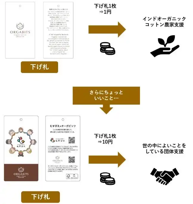 ORGABITSを使用した商品1点につき1円を、インドのコットン農家を支援する「一般財団法人 PEACE BY PEACE COTTON」に贈呈しています。 |