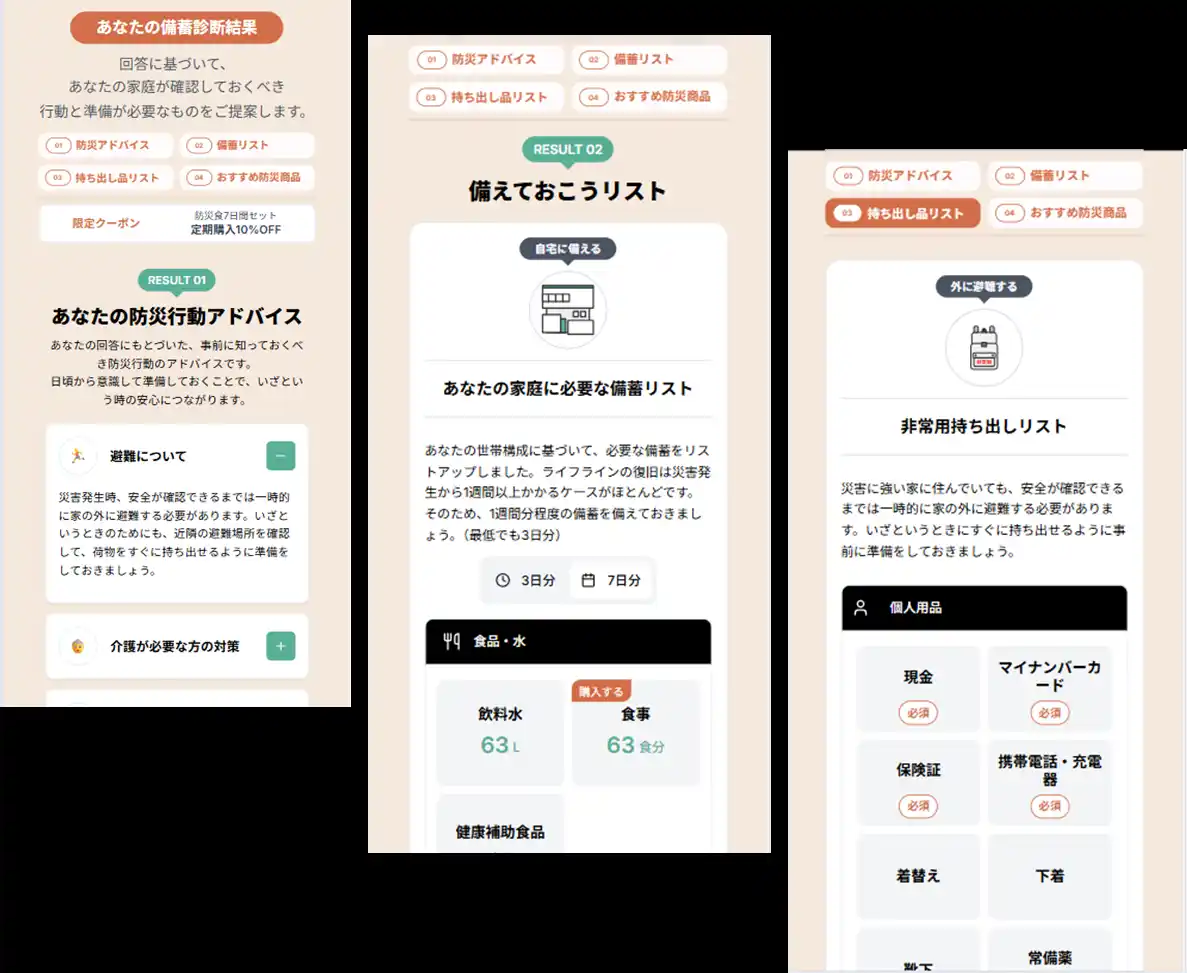 家族構成や生活習慣に応じたパーソナライズ診断を行い、防災行動のアドバイスや一時避難に必要な持ち物リス ト、在宅避難に必要な備蓄リストやその数量など、家族に最適な防災対策を提案します。 |