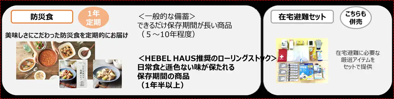 防災備蓄に必要な防災食・防災グッズ(在宅避難セット)などをHEBELIAN NET.のECサイトで簡単に購入できます。当社が提供するセレクト防災食は、日常食と遜色ない味が保たれる保存期間1年半以上の商品を取り扱い、防災食の「備蓄と消費」のサイクルを早めることで、防災食のローリングストックを目指します。また、災害対策として関心が高まっている太陽光発電および蓄電池の設置についても、旭化成リフォームに相談が可能です。これらを行うことで、防災意識の希薄化の防止、災害時の実践力の向上、美味しい防災食の利用、家族の防災コミュニケーション機会の創出などにつなげていきます。 |