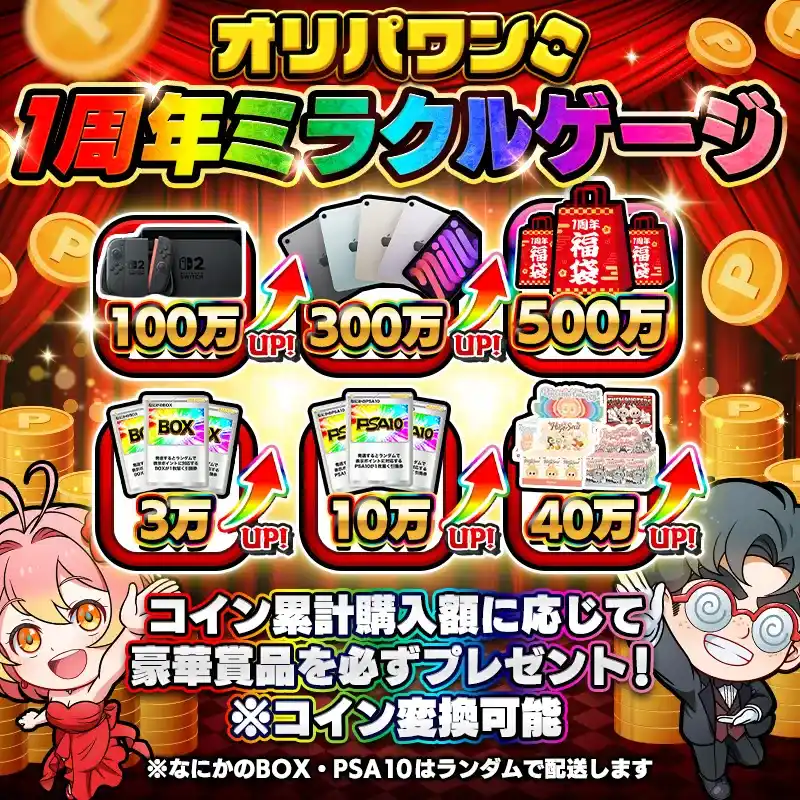 | オンラインオリパサイト「オリパワン」(https://oripaone.jp)では、2025年7月から展開してきた1周年記念イベントがいよいよ最終週に突入いたします。 | |||