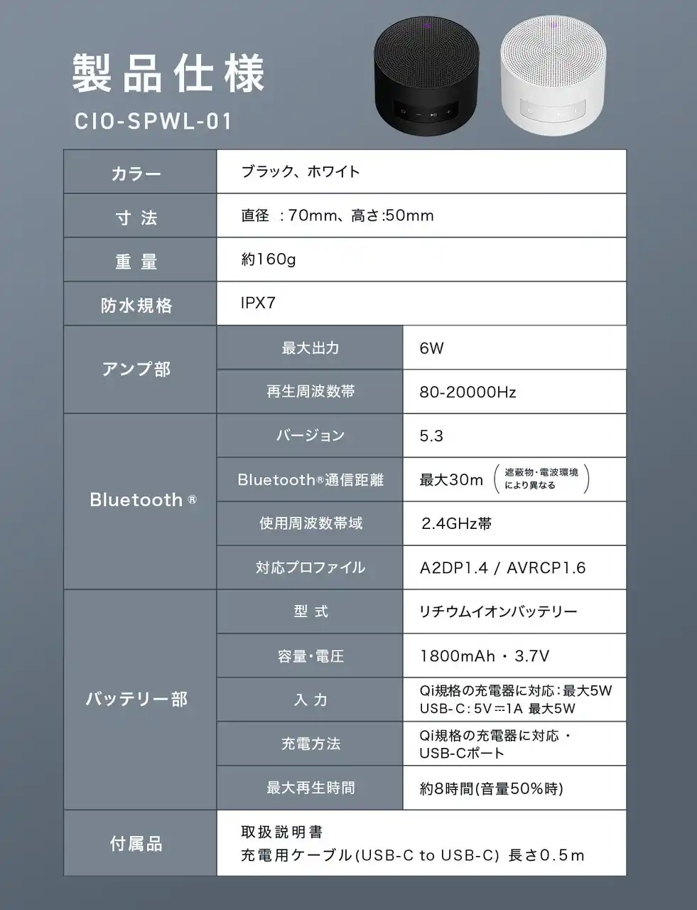 マグネット吸着と防水規格IPX7で、浴室でも安心して音楽やラジオを楽しめます。さらにQi規格の充電器にも対応しているので、Qi2対応充電器があればスマートに充電でき(※充電器は別売り)、最大8時間の連続再生が可能です。スマホやタブレットからBluetooth接続により、手軽に再生できます。手のひらサイズ・わずか160gの軽量設計で、家の中でも外出先でも気軽に持ち運べ、2台同時接続によるステレオ再生で臨場感あふれるサウンド体験を実現します。 |