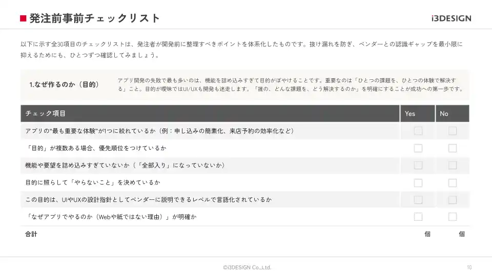 | 株式会社アイスリーデザイン(本社:東京都港区、代表取締役:芝陽一郎、以下:当社)は、ホワイトペーパー「アプリ開発 発注前チェックリスト」を公開いたしました。 | |||||||||
