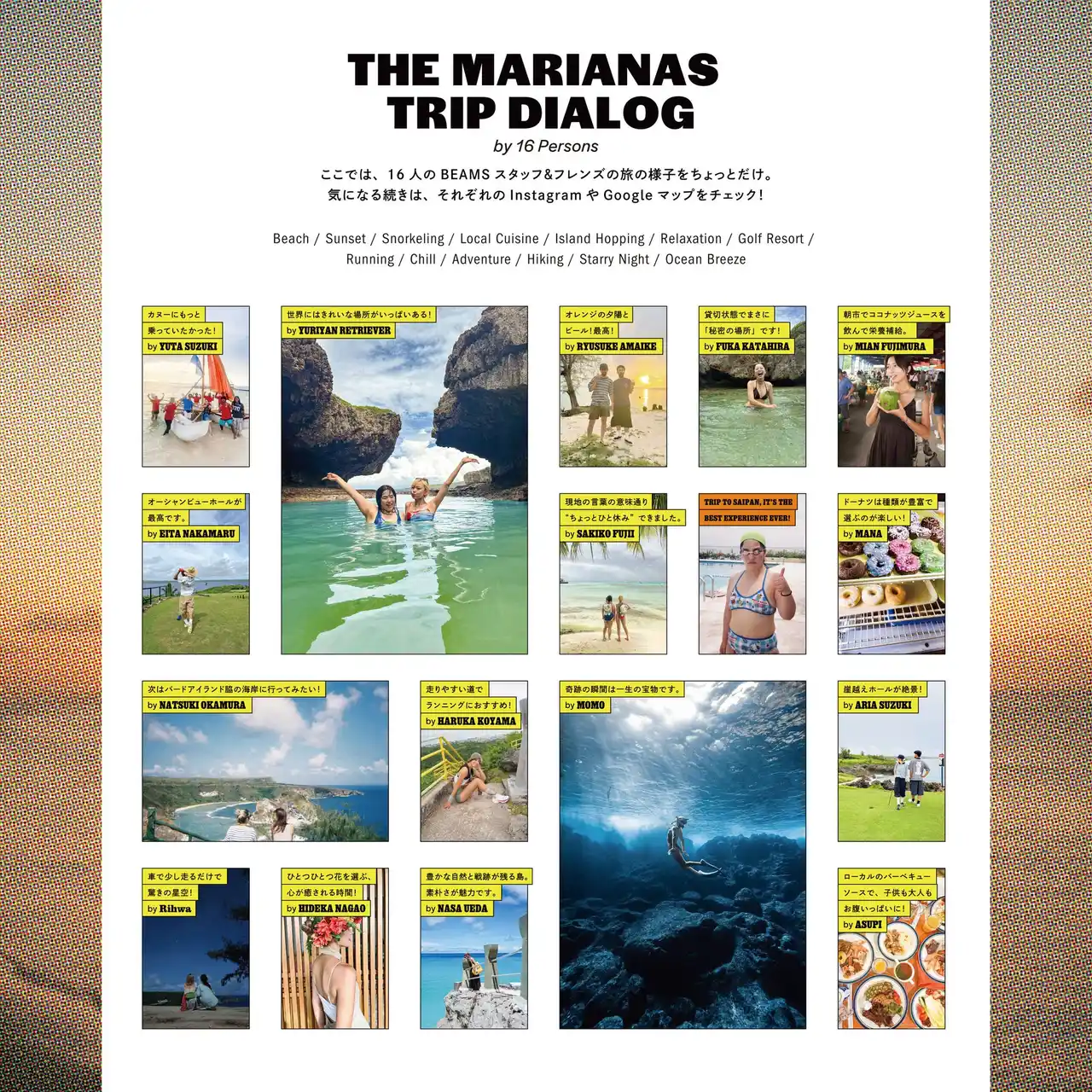 ビームススタッフや友達、親交のあるインフルエンサー、メディア関係者がマリアナ諸島を実際に訪問し、海・自然・食・カルチャーを全身で体感。その様子を写真や動画とともに特設WEBサイトで公開いたします。透明度の高い海、ローカルフードとの出会い、現地の人々との交流など、参加者それぞれの視点で切り取った“マリアナの今”を一挙に集約。旅の参考になる最新スポットや体験談、渡航情報も盛り込み、ページを開けば旅の空気が伝わる内容になっています。さらに、この特設サイトは冊子としても制作し、 JATA ツーリズムEXPOジャパンのイベント会場で配布予定。オンラインでもオフラインでも、マリアナ諸島の魅力を存分に味わえる機会となります。 |
