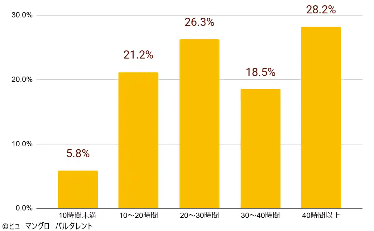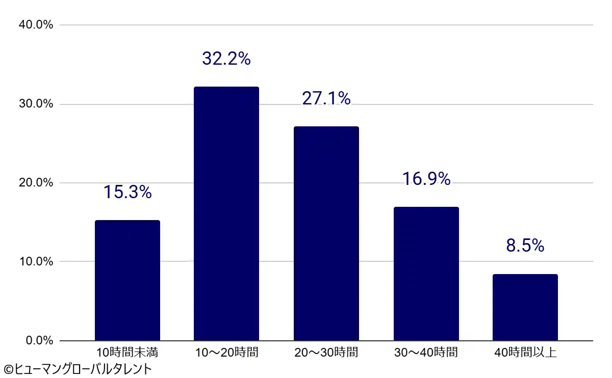 希望残業時間 特定技能クラスは「10~20時間」(32.2%)が最多だったのに対し、技能実習クラスは「40時間以上」(28.2%)が最多となり、ワークライフバランスを求める特定技能と、収入を重視する技能実習という対照的な姿が浮かび上がりました。 |