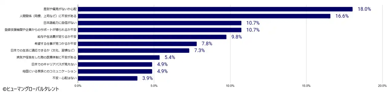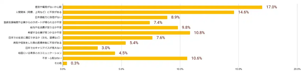 日本での就労にあたり、両クラスが共通して抱える最大の不安は「差別や偏見がないか心配」(特定技能18.0%、技能実習17.0%)、次いで「人間関係に不安がある」(特定技能16.6%、技能実習14.6%)でした。給与や待遇といった条件面だけでなく、外国人材が安心して能力を発揮できる、インクルーシブな職場環境の整備が、これまで以上に重要になっていることを示唆しています。 |