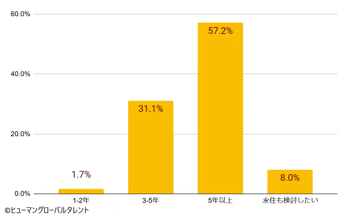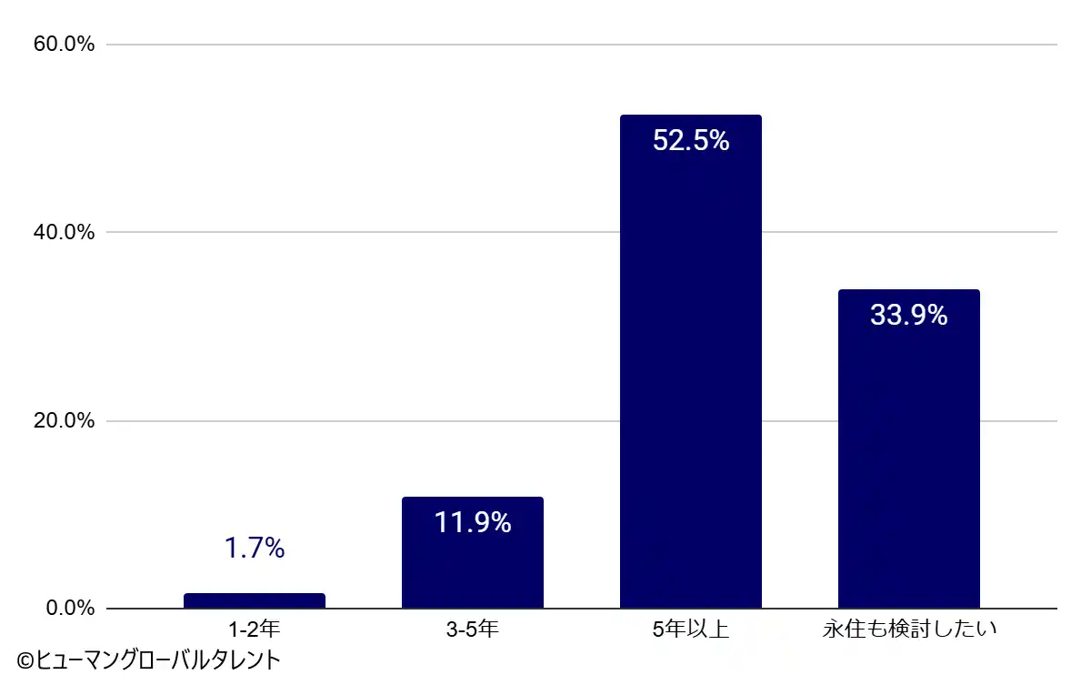 驚くほど高い長期就労意欲: 在留資格に関わらず、半数以上が「5年以上の長期就労」を希望。日本企業への高い定着意欲が明らかに |