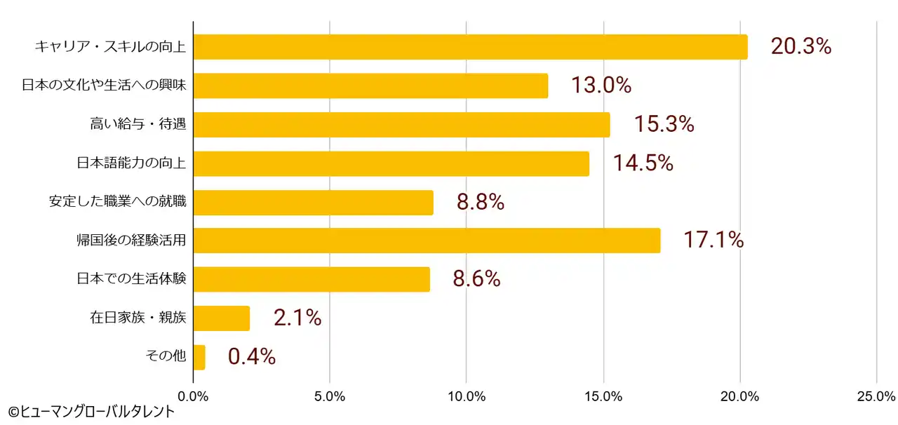 最大の就労理由は「キャリア・スキルの向上」であり、日本での経験を通じた自己成長への強い意欲がうかがえます。 |