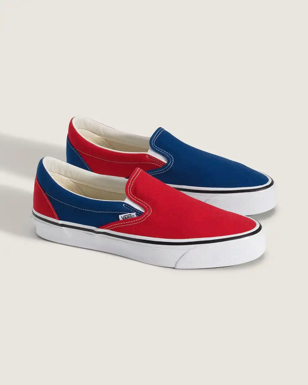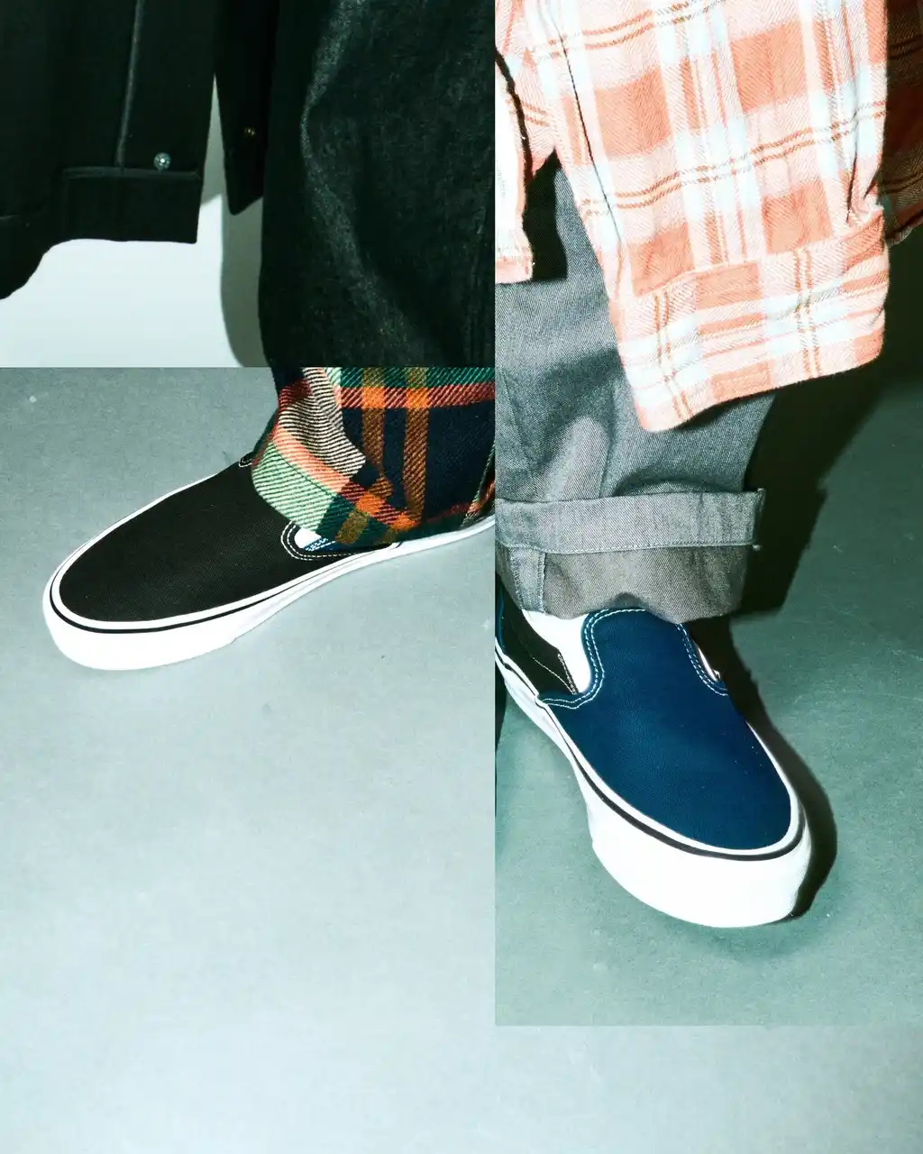 左右で異なるカラーのAuthenticを履いたスケーターが登場した広告で、片足ずつ友人と交換したというエピソードが添えられていました。この印象的なアーカイブ広告をベースに、ENGINEERED GARMENTSならではの職人技を感じさせるディテールと、アシンメトリーを意識した配色をSlip-Onに落とし込みました。 |