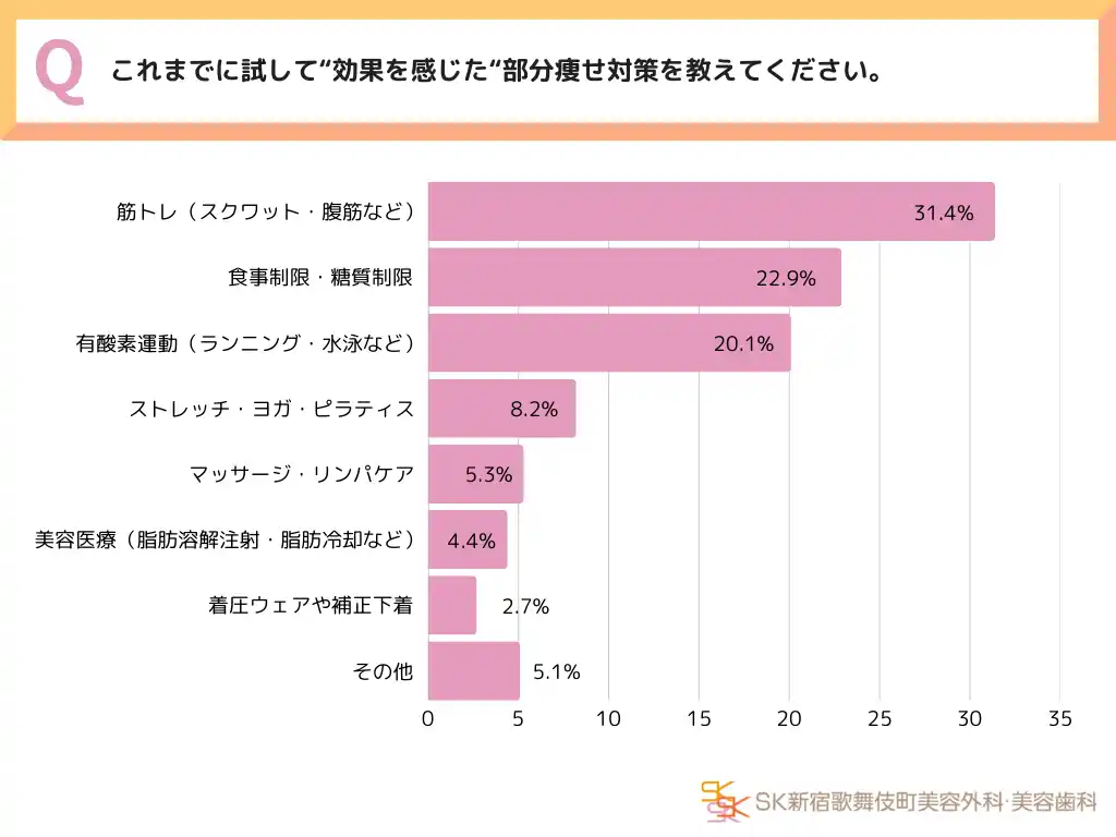 | 筋トレや有酸素運動、食事管理は一定の効果が認められる一方、マッサージや美容医療などの手軽な方法を試す人はまだ少数です。現代人の多忙なライフスタイルを考えると、効率的かつ科学的に部分痩せを実現できる方法への関心は高まる傾向にあります。実際、筋トレや運動を取り入れても効果を感じるまでに時間がかかることが多く、継続力や正しいフォームの習得が成功の鍵となります。 | |||||||||||||||||