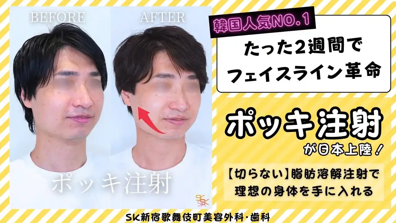 | SK新宿歌舞伎町美容外科・歯科で提供する【ポッキ注射(脂肪溶解注射)】は、自己流では落としにくい部分脂肪にアプローチできる医療ダイエットです。気になる部位にピンポイントで効果を期待でき、短期間で理想のラインに近づけることが可能。 | |||||||||||||||||