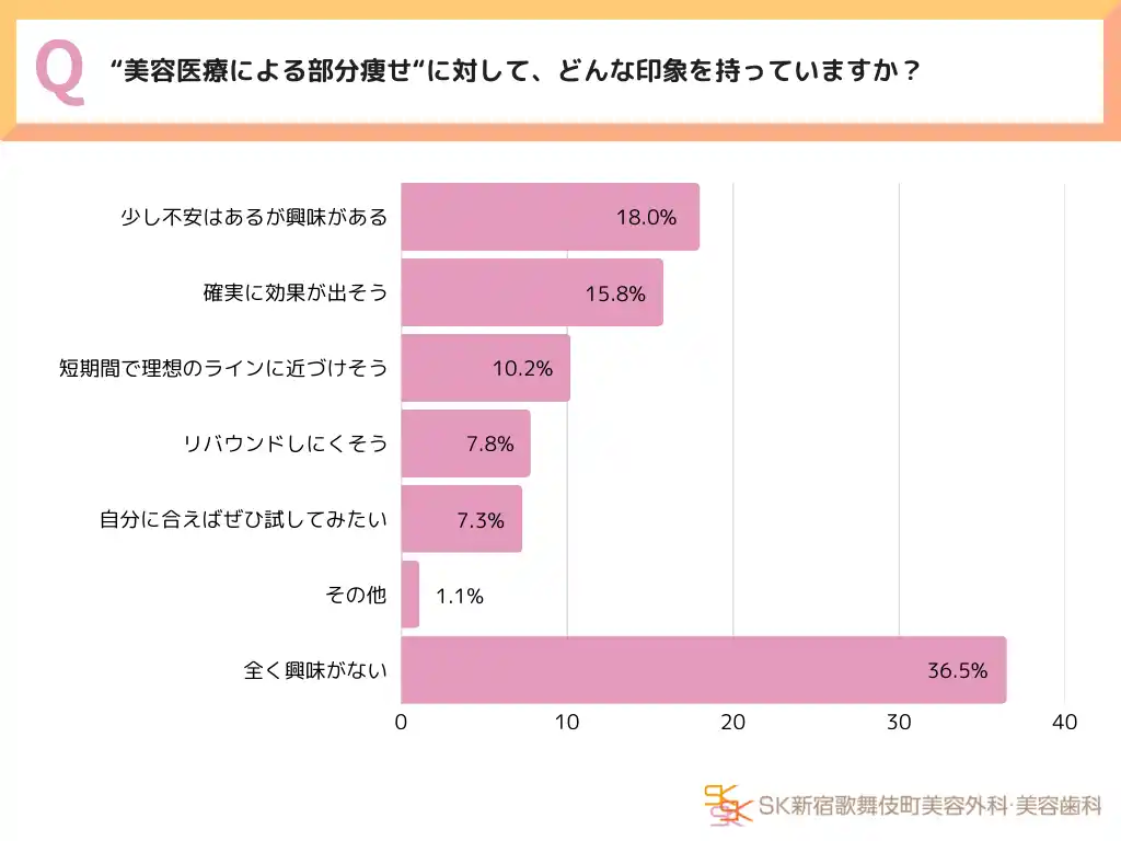 | 部分痩せを短期間で効率的に叶えたいと考える人々から、美容医療への期待は少しずつ高まっています。確実に効果を実感したい、理想の体型に近づきたいと考える層が注目しており、今後のダイエットニーズに応える新しい選択肢として伸びしろがあることが分かります。従来の自己流ダイエットでは得られにくい結果を、専門家のサポートのもとで効率的に得られる点が、美容医療の魅力として広がっています。 | |||||||||||||||||