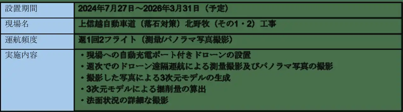 2024年7月に運用開始以降、チャットアプリによる現場の退避状況や天候などの安全確認を併用して1年間無事故で週次のリモート測量を継続運用することに成功しました。 |