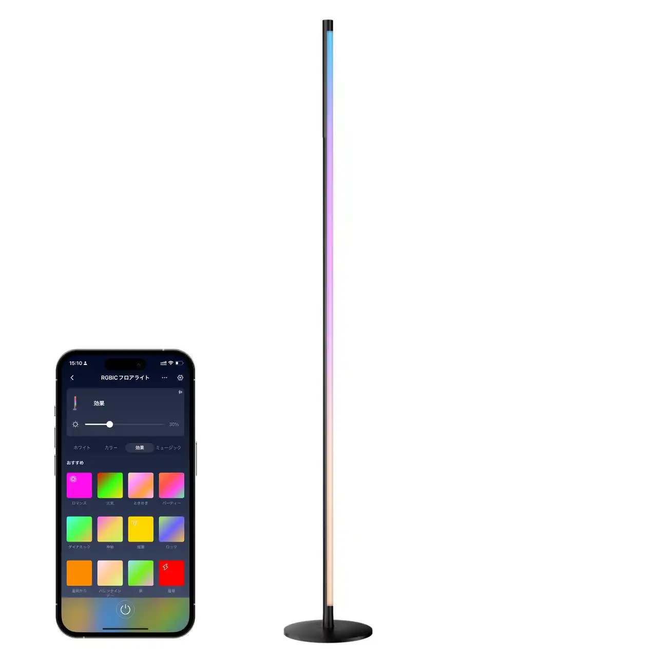 光の三原色(赤青緑)のLEDチップを搭載し、それらひとつ一つの明かりを個別のICで細かくコントロールして発光させる「RGBIC技術」により、ひとつのフロアライトを同時に複数の色に発光させることで、グラデーション効果やイルミネーション効果などによる、さまざまな空間演出を叶えます。 |