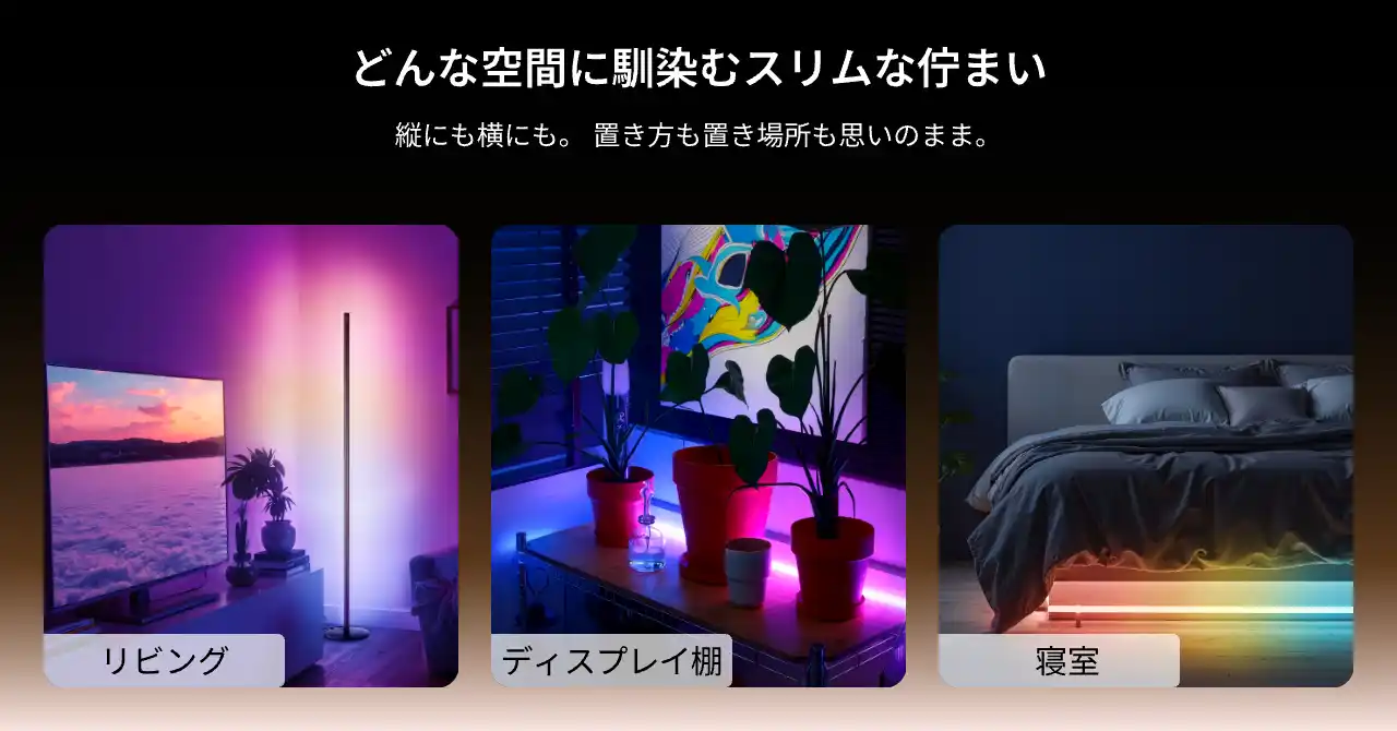Matter対応で複数のプラットフォームを跨いで、iPhoneやSiriなどApple製品のホームアプリから、フロアライトをON/OFFしたり、明るさや色を調節したりできるように。また、その他Matterデバイスと連動してシーンを実行するオートメーション操作も可能。Google HomeやAlexaなど複数のサードパーティーサービスにも対応。 |