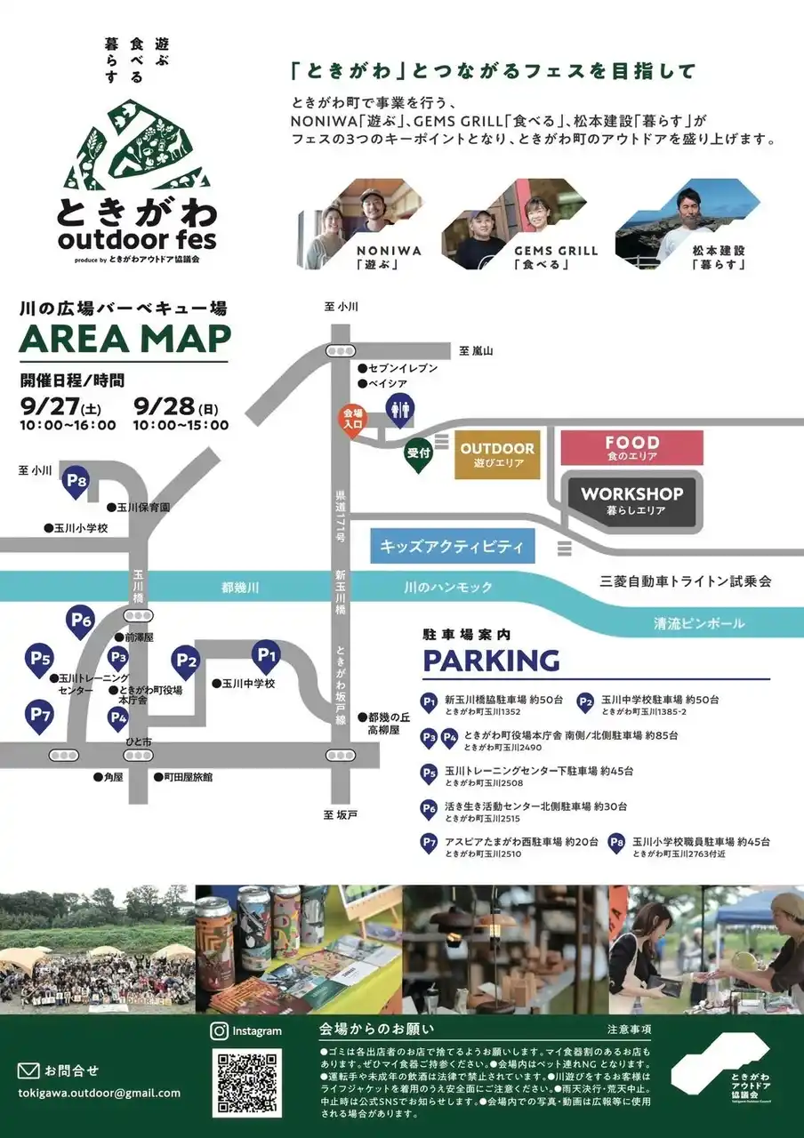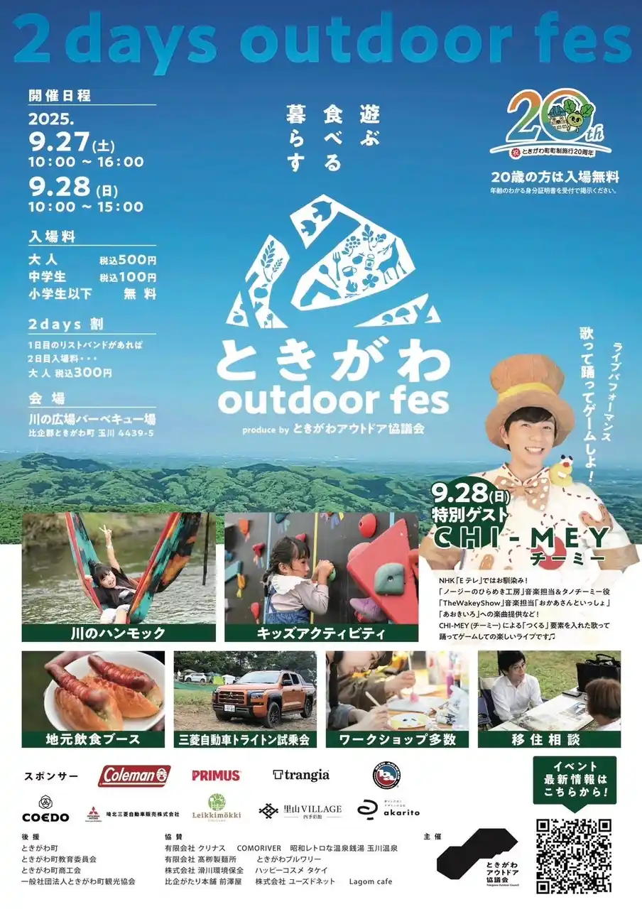 | ときがわアウトドア協議会(代表 関和光広、埼玉県比企郡ときがわ町)は、秋の香りが漂い始める9月27日(土)・28日(日)に、人口10,162人(R7.8.1現在)の小さな町・埼玉県ときがわ町にある「川の広場」で「ときがわoutdoor fes2025(ときがわアウトドアフェス)」を開催します。 | |||||||||||||||||||