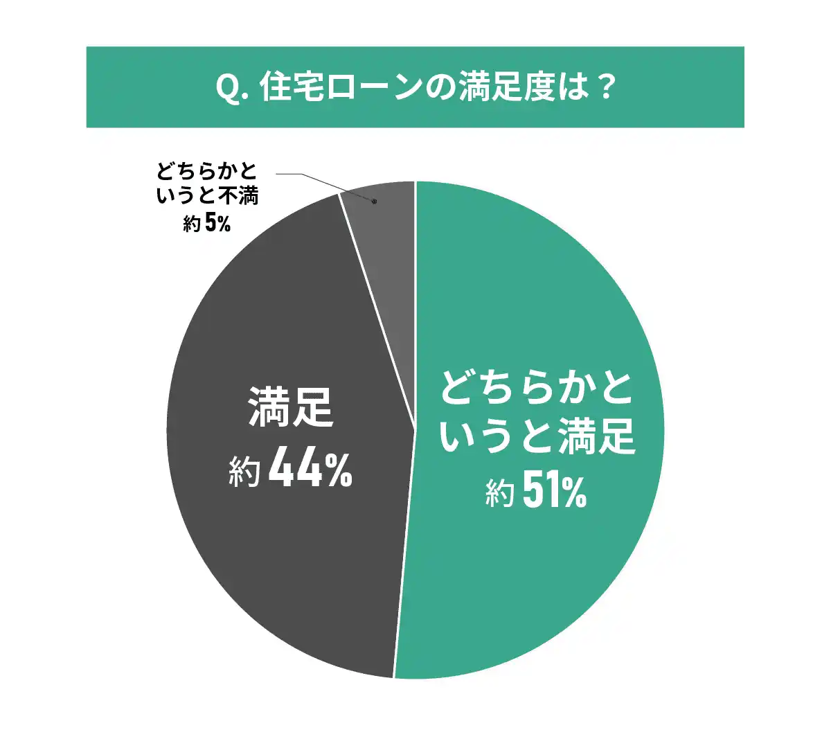 住宅ローンに対する満足度は全体的に高く、「満足」が約44%、「どちらかというと満足」が約51%で、満足層が約95%に達しています。不満を持つ人は「どちらかというと不満」が約5%のみで、「不満」は0名でした。この高い満足度は、慎重な選択プロセスの結果と考えられます。 |