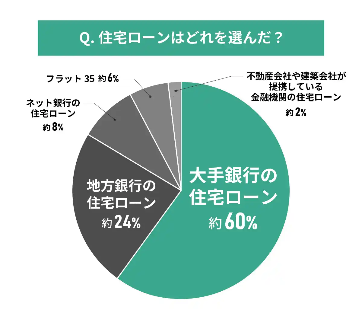 住宅ローンの選択において、借入先の選択は購入者にとって重要な意思決定です。調査結果では、大手銀行を選択する人が圧倒的に多く、安心感や信頼性を重視する傾向が明確に現れています。この傾向は、住宅ローンという長期間にわたる大きな借入に対する慎重な姿勢を示しています。 |