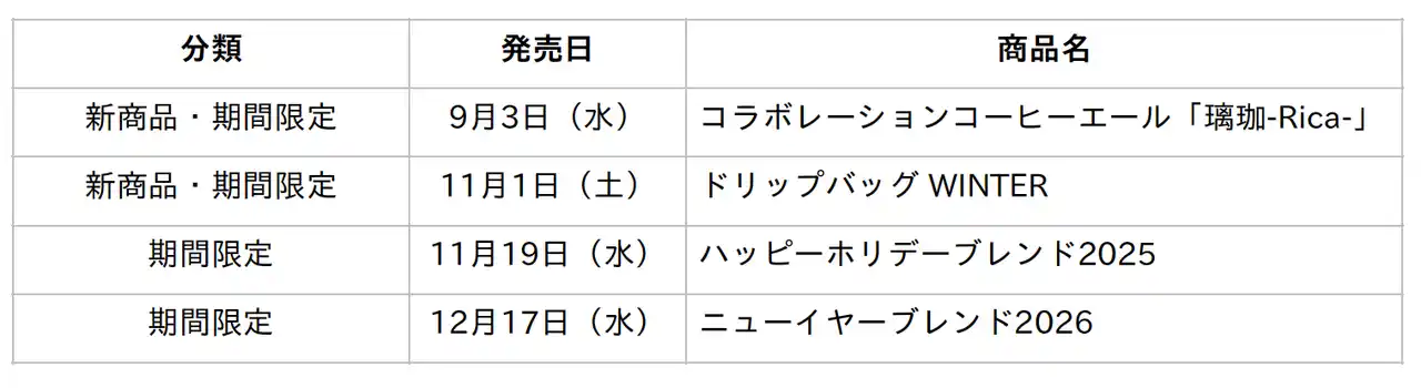 スペシャルティコーヒー専門店の株式会社堀口珈琲(本社:東京都世田谷区、代表取締役社長:若林恭史)は、 冬のギフトシーズンに向けた限定商品を9月から12月にかけて堀口珈琲各店舗・オンラインストアで順次発売いた します。ドリップバッグの新フレーバー「WINTER」、コエドブルワリーとのコラボレーションコーヒーエール「璃 珈-Rica-」、冬季限定のブレンドコーヒーなど、大切な人と過ごす時間や、クリスマスやお歳暮などの贈り物にも 相応しいラインナップを取り揃えました。 |