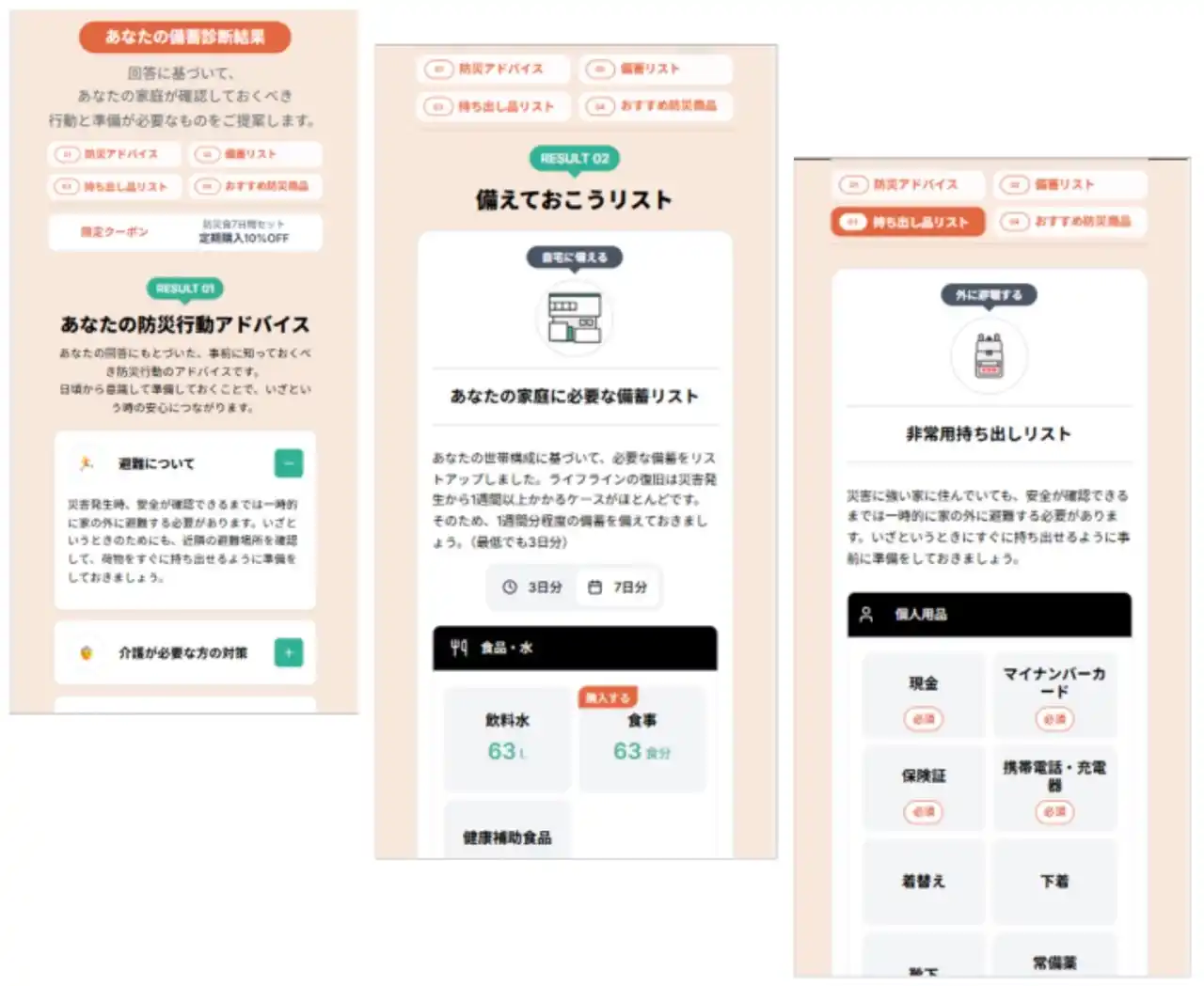 本サービスは、家族構成や生活習慣などの情報に基づいた防災診断機能を中心に、防災備蓄品のEC購入、定期的な通知・再診断を組み合わせたワンストップ型の支援サービスです。診断結果に応じて、各家庭に必要な備蓄品や防災行動アドバイスを個別に提案し、さらにローリングストックができる防災食の定期購入で、継続的な備えをサポートします。 |