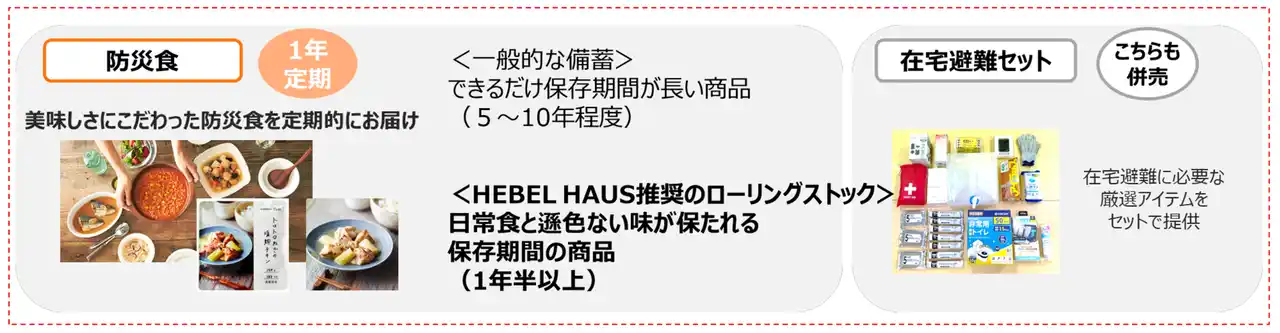 防災備蓄に必要な防災食・防災グッズ(在宅避難セット)などを HEBELIAN NET.の EC サイトで簡単に購入できます。当社が提供するセレクト防災食は、日常食と遜色ない味が保たれる保存期間1年半以上の商品を取り扱い、防災食の「備蓄と消費」のサイクルを早めることで、防災食のローリングストックを目指します。また、災害対策として関心が高まっている太陽光発電および蓄電池の設置についても、旭化成リフォームに相談が可能です。これらを行うことで、防災意識の希薄化の防止、災害時の実践力の向上、美味しい防災食の利用、家族の防災コミュニケーション機会の創出などにつなげていきます。 |