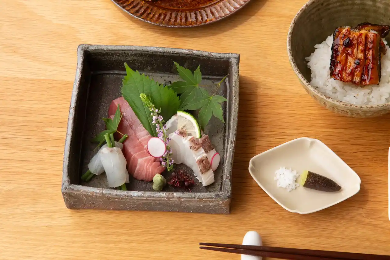 ごはんものには、ひつまぶしに仕上げた特産品うつぼをご用意。まずはそのまま、そして万能ねぎやミョウガなどの薬味とおだしをかけてお召し上がりください。 |