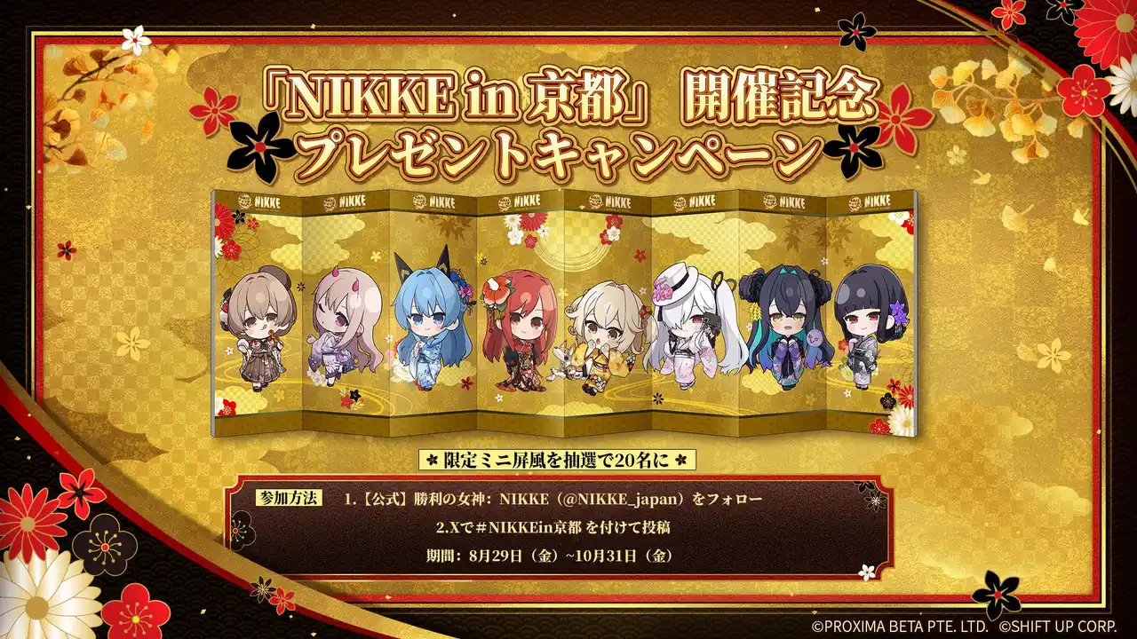 京都コラボを記念してプレゼントキャンペーンも実施いたします。公式Xアカウント(@NIKKE_japan)をフォローし、対象投稿をリポストいただいた方の中から抽選で20名様に【特製ミニ屏風】をプレゼントいたします。応募期間は2025年10月31日(金)までとなっておりますので、ぜひご参加ください。 |
