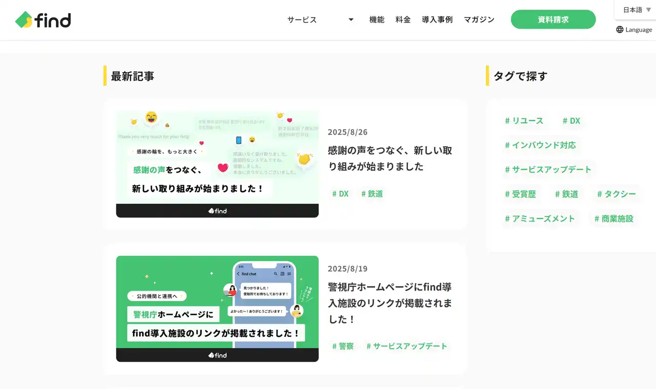 株式会社findでは、落とし物クラウドの運営にとどまらず、社会や企業における“落とし物”の課題解決をテーマにしたオウンドメディア 「find way」(https://service.finds.co.jp/findway)を発信しています。 落とし物をめぐる最新の取り組みや事例、業界動向、導入企業の声などを取り上げ、企業や自治体にとってのヒントとなる情報をお届けしています。 |