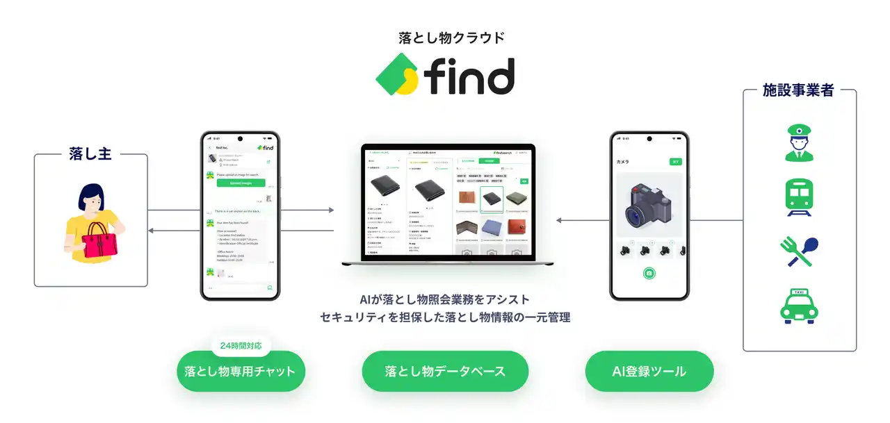 | 「find chat」は、アプリのインストール不要、メールアドレスによる簡単な認証だけで利用できる多言語対応チャット機能です。 対応言語は、日本語・英語・中国語(簡体字)・韓国語。鉄道会社・商業施設・自治体などの拾得者と、落とし主である外国人利用者との間にある言語の壁を解消します。AI画像検索や自動翻訳技術とも連携し、現場の負担軽減にも貢献しています。なお、LINE版は多言語対応しておらず、今後は外国語対応可能な「find chat」へ順次切り替えを予定しています。 | ||||||||||||