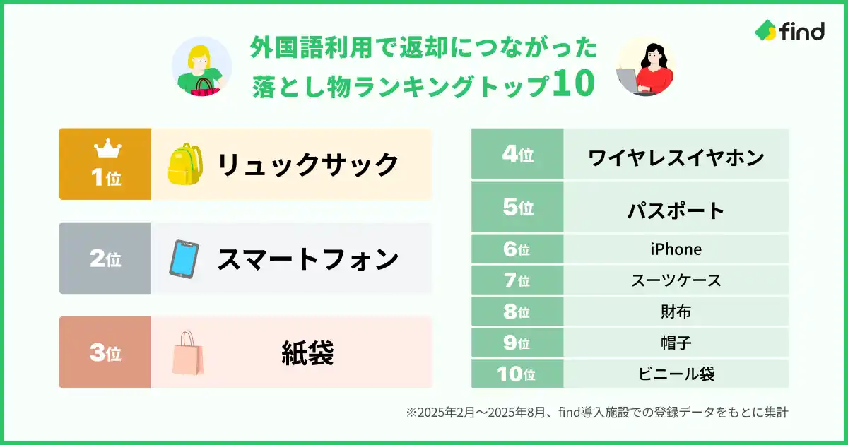 | サービス開始からわずか約6カ月で、外国語利用件数は累計4,200件に到達。返却に結びついた落とし物の中には、リュックサックやスマートフォンといった日常的な品に加え、パスポートやスーツケースといった旅行者ならではの重要品もランクインしました。 | ||||||||||||