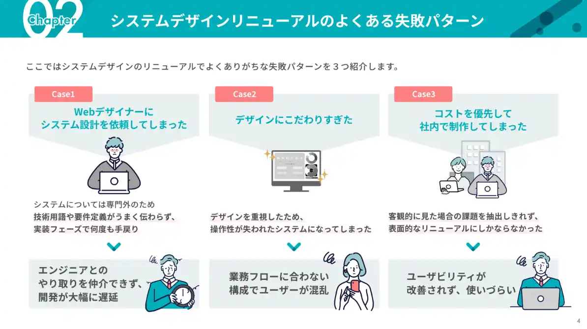 | 結果として、「見た目は良いが使いづらいシステム」が完成し、再設計・再開発によるコスト増加を招いてしまいます。 | |||