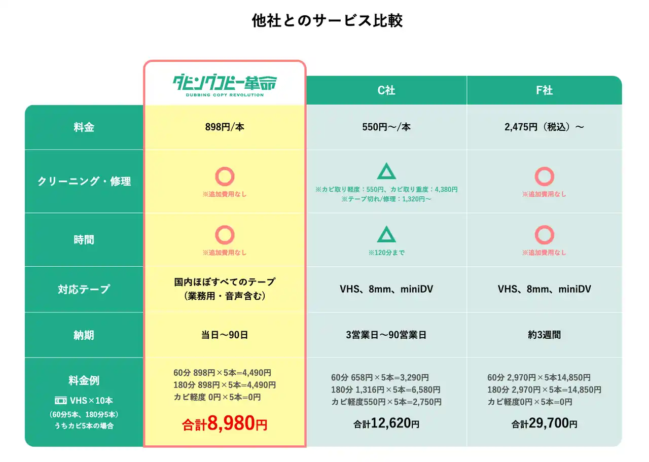 VHS10本のダビングを依頼したケースで比較すると、ダビングコピー革命ならば3,000円~1万円程度他社よりも安くなります。 |