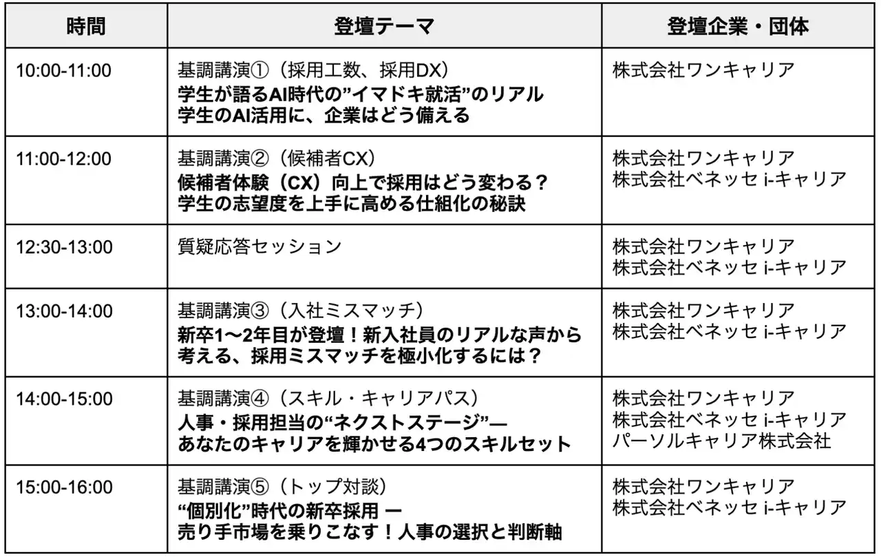 | 新卒採用サービス「ワンキャリア」を提供する株式会社ワンキャリア(本社:東京都渋谷区、代表取締役社長 執行役員CEO:宮下 尚之)は、新卒オファーサービス「dodaキャンパス」を運営する株式会社ベネッセ i-キャリア(本社:東京都新宿区、代表取締役社長:風間 直樹)と、2025年9月16日(火)から19日(金)に企業人事向けオンラインカンファレンス「新卒採用カンファレンス 2025秋」を共同開催します。このたび、本カンファレンスの基調講演のテーマが決定いたしましたので、お知らせいたします。 | ||||||||