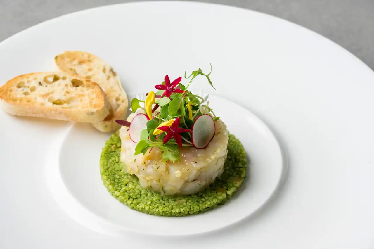 | 【前菜】「平貝と甘海老のタルタル ルッコラのタブレ 柚子ヴィネグレット」 | ||||||||||||||||