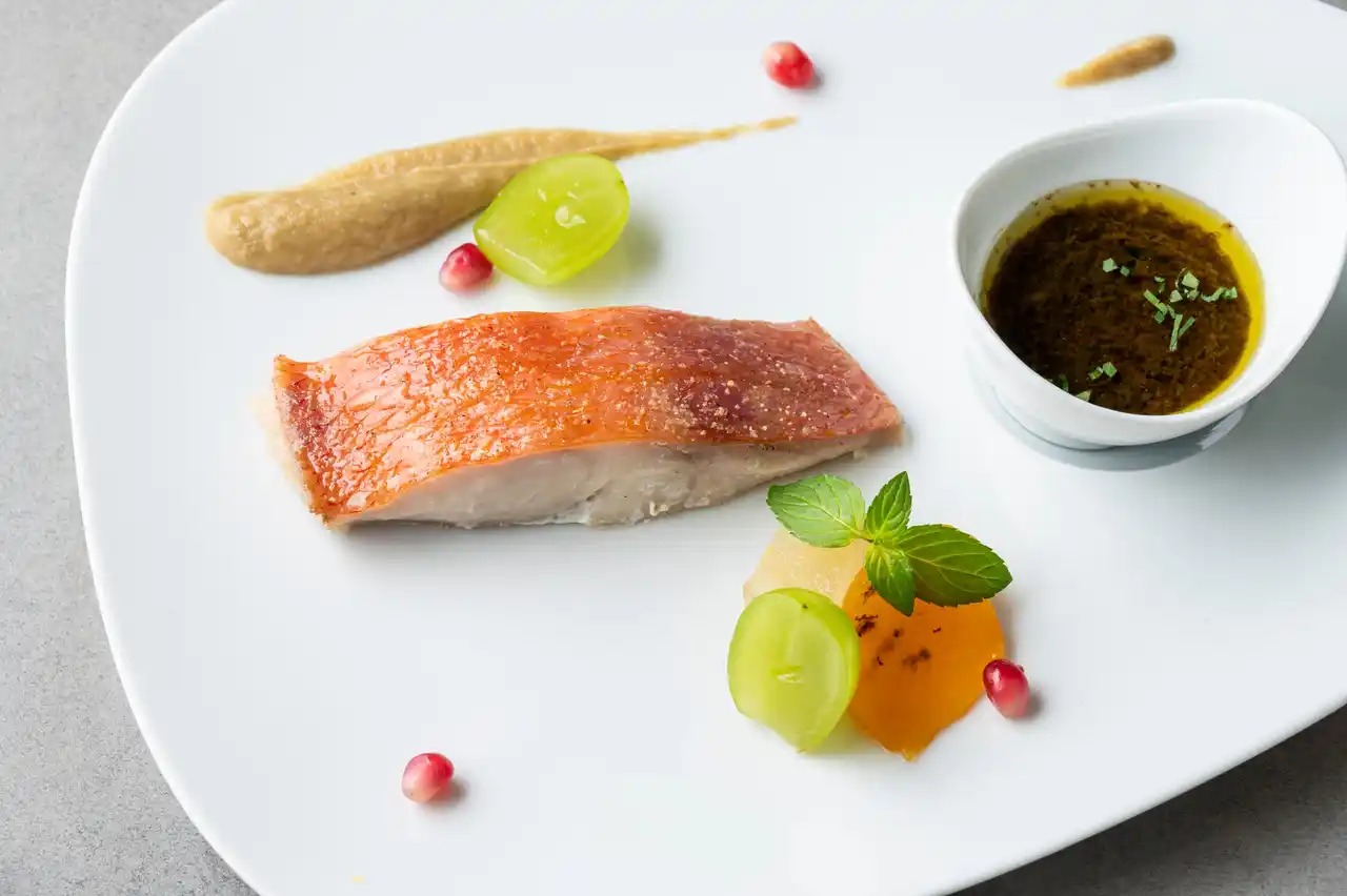| 【魚料理】「下田産金目鯛のヴァプール オリーブソースとフルーツピクルス」 | ||||||||||||||||