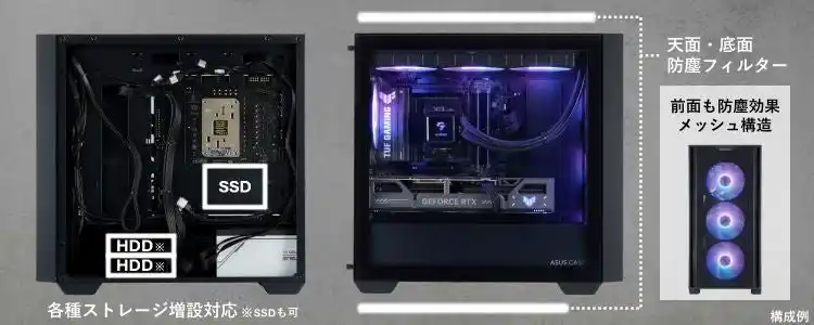 天面・底面には、防塵フィルターを標準搭載。前面も防塵効果のあるメッシュ構造により、パソコンにとって大敵であるホコリの侵入を防ぎつつ、スムーズなエアフローで効果的に冷却し、外部へ廃熱します。 また、2.5 SSD を最大3台、3.5 HDD を最大2台まで増設対応。お手持ちのストレージをご活用することができます。 |