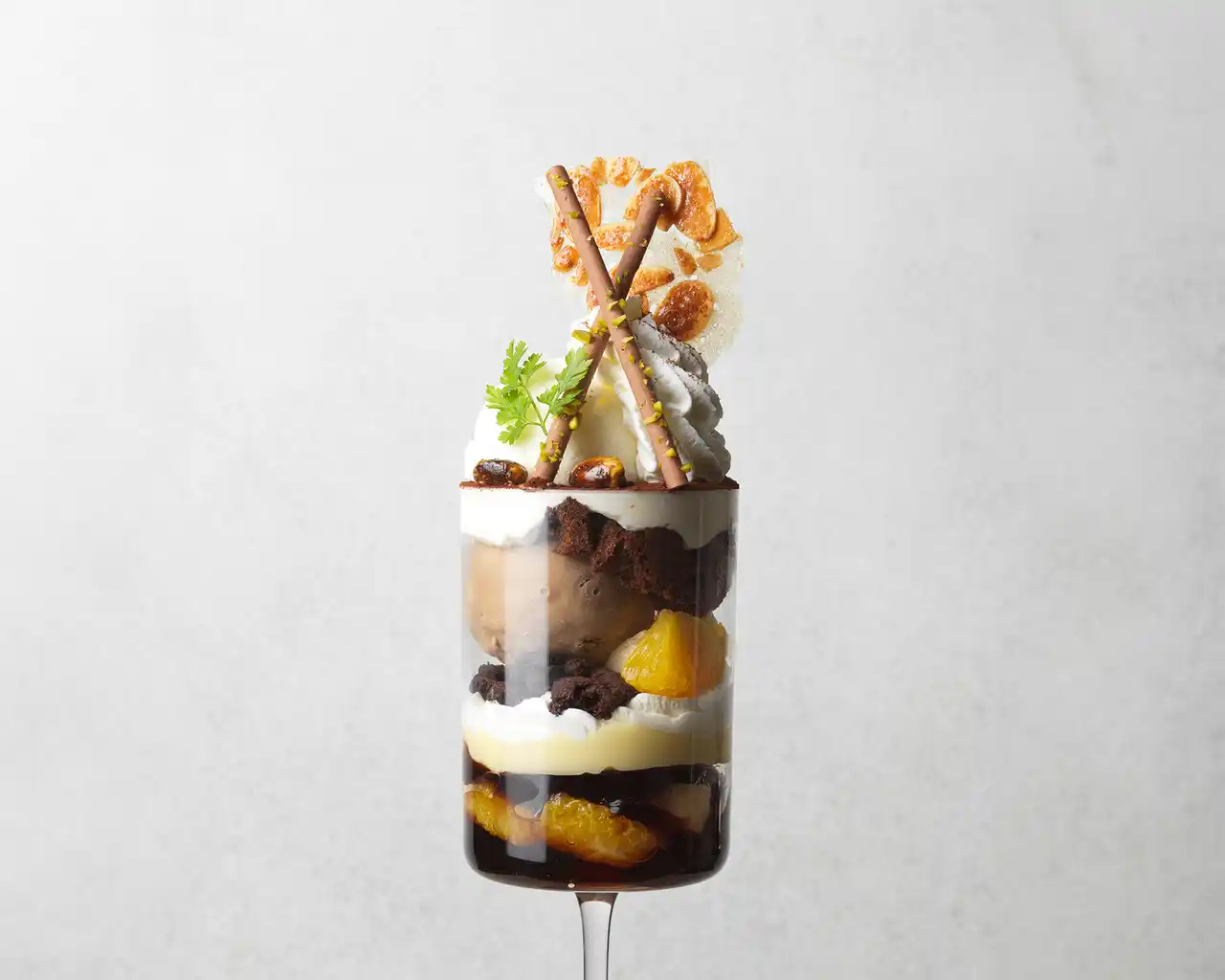 なめらかなコーヒージュレに、バナナ、酸味のアクセントにオレンジを合わせ、コクのあるカスタード、程よい甘さのシャンティを絞りました。グラスショコラカフェオレ、エスプレッソを染み込ませたココアスポンジをトッピングし、奥深い味わいを演出。マスカルポーネクリームとグラスジャージーを合わせることで、奥深さの中にまろやかな味わいを感じていただけます。 |