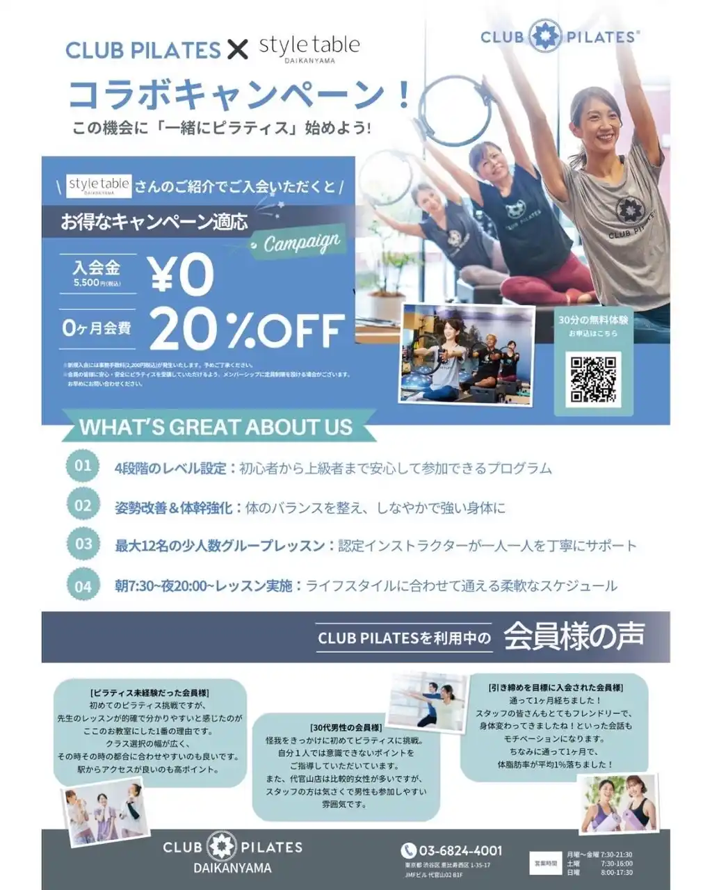 | style table 代官山店からのご紹介でCLUB PILATE 代官山店にて無料でピラティス体験レッスンを受けられます。また、期間内であれば入会金無料、初月20%割引も。この機会にぜひ世界最大級のマシンピラティスをお試しください。 | |||||||||