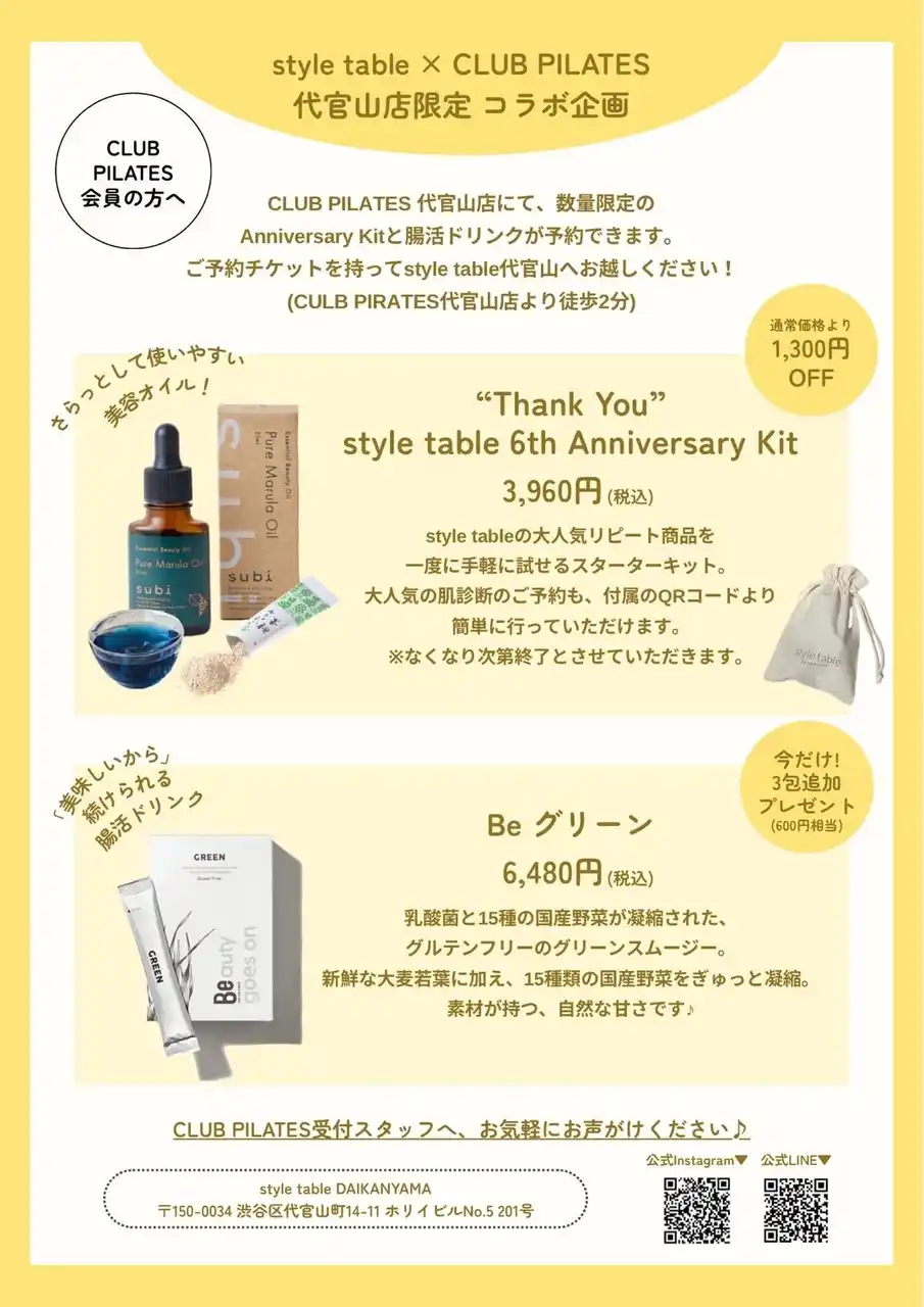 | CLUB PILATES 代官山店にて、数量限定”Thank You” style table 6th Anniversary Kitとグリーンスムージーが予約できます。配布されたチケットを持ってstyle table 代官山本店へご来店され、グリーンスムージーをご購入された際には、3本追加でプレゼント致します。 | |||||||||