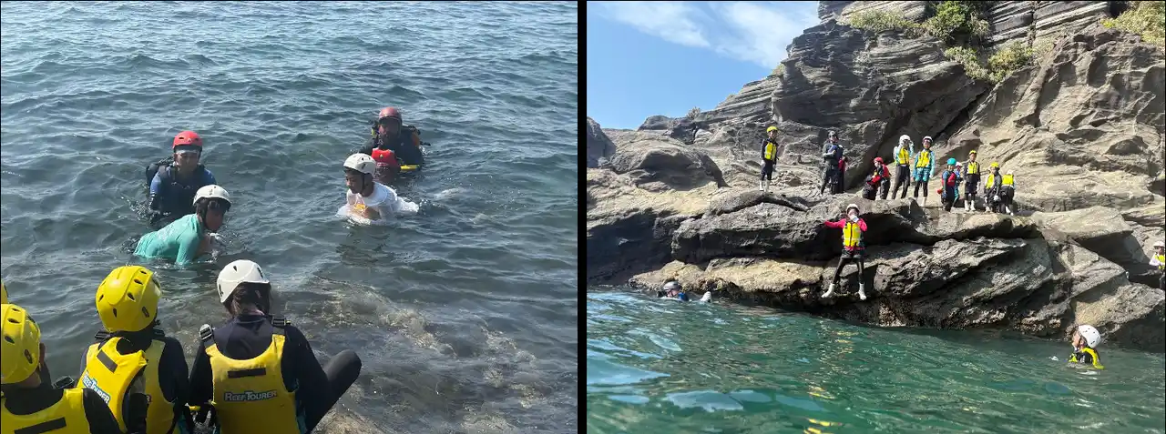 2日目の午後は、大房岬自然公園に移動し、海岸の岩場を歩いたり、よじ登ったり、海に飛び込んだりしながら進むアクティビティ「コーステアリング」を体験しました。 |