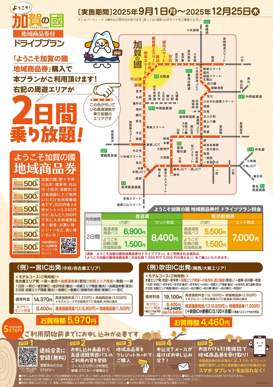 | この商品は、中京圏や関西からの出発で、お得にご利用いただける高速道路周遊パス(高速道路割引)と、南加賀6市町の観光施設、飲食店、物産店などで利用できる地域商品券3,000円分がセットになっています。 | |||||||||