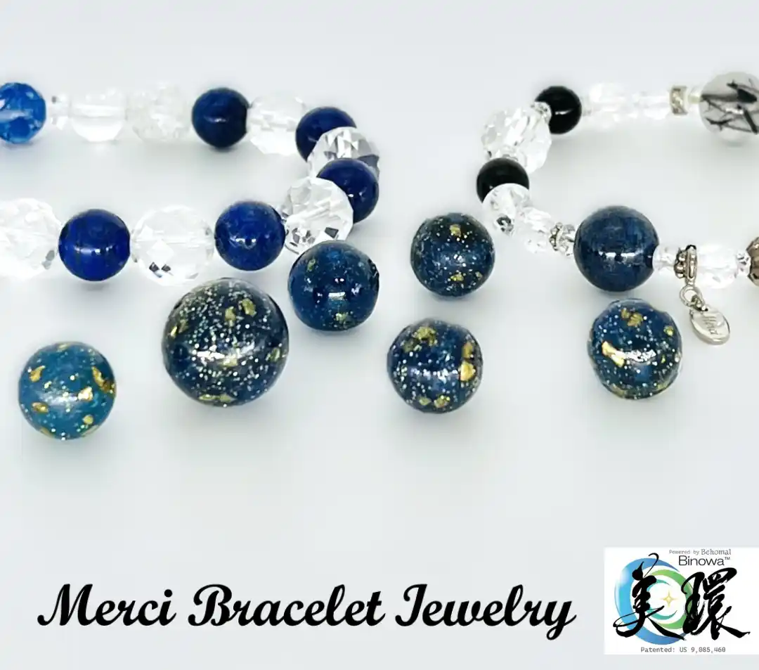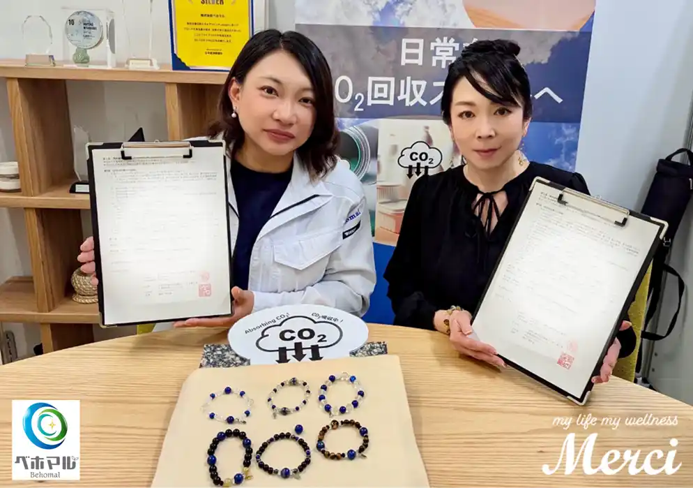 ジュエリーでウェルビーイングをサポートする【Merci Bracelet Jewelry~メルシーブレスレットジュエリー】(本社:大阪市北区梅田/TRANS WORLD代表:隅田あすか、以下「MBJ」)は、株式会社ベホマル(本社:滋賀県草津市、代表取締役:西原麻友子、以下「ベホマル」)の、CO2吸収材「美環(TM)(びのわ)」を配合した「Lazulith(ラズリス、以下「Lazulith」)」を製作しました。 |