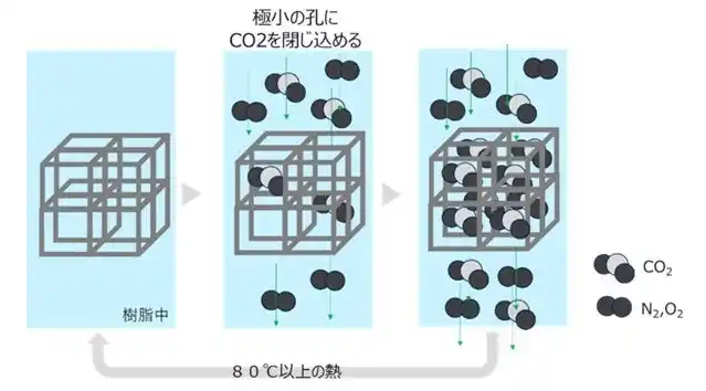 樹脂中での吸収メカニズム。樹脂中に透過してきた二酸化炭素を美環中に固定します。 |