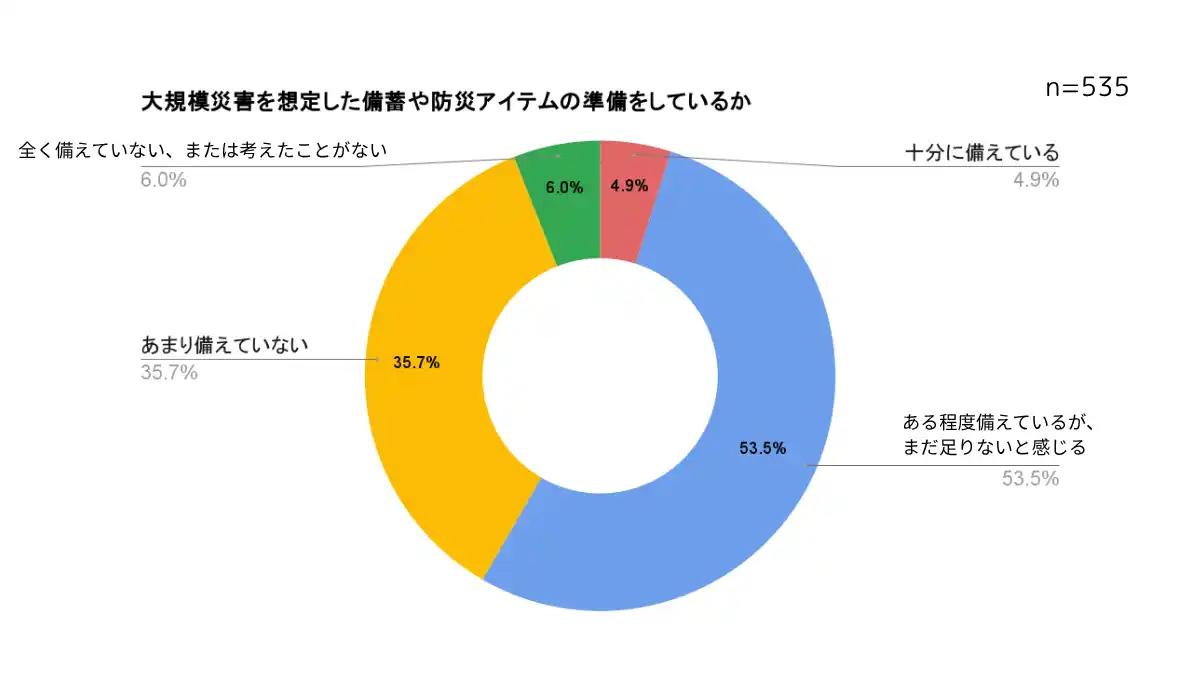 ・「十分に備えている」と回答した人はわずか5%程度で、ほとんどの人が自宅での備えが十分ではないと感じている |