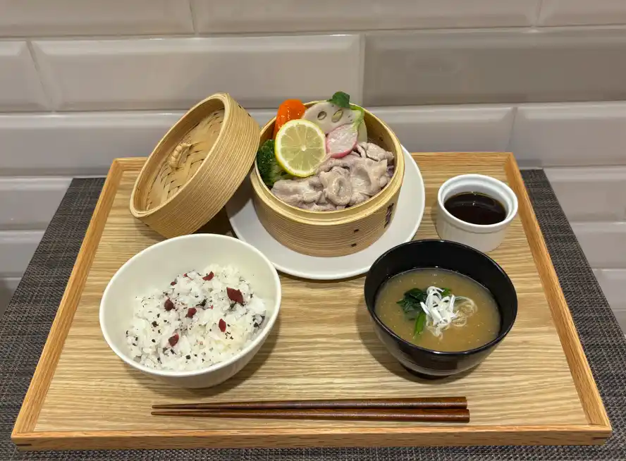 | メニュー名:豚肉と野菜のレモン蒸篭蒸し~梅しらすごはん・小松菜と長葱の味噌汁付き~ | ||||||||||||||
