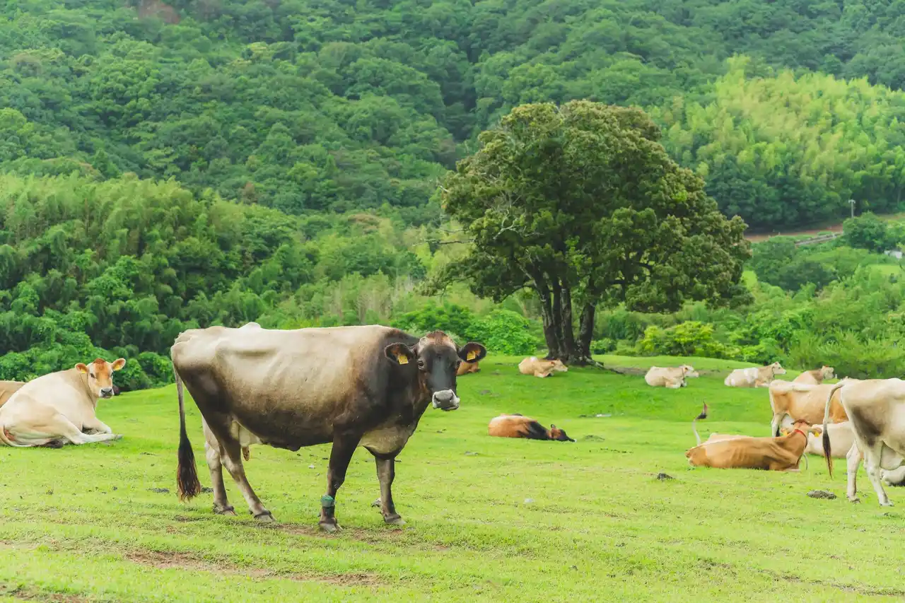 高知県中東部の香美市、清流・物部川の上流にある「雪ヶ峰牧場」では、約120ヘクタール(東京ドームの約25倍)の広大な敷地に、わずか70頭ほどのジャージー牛が、一年中昼も夜も放し飼いにされています。 |
